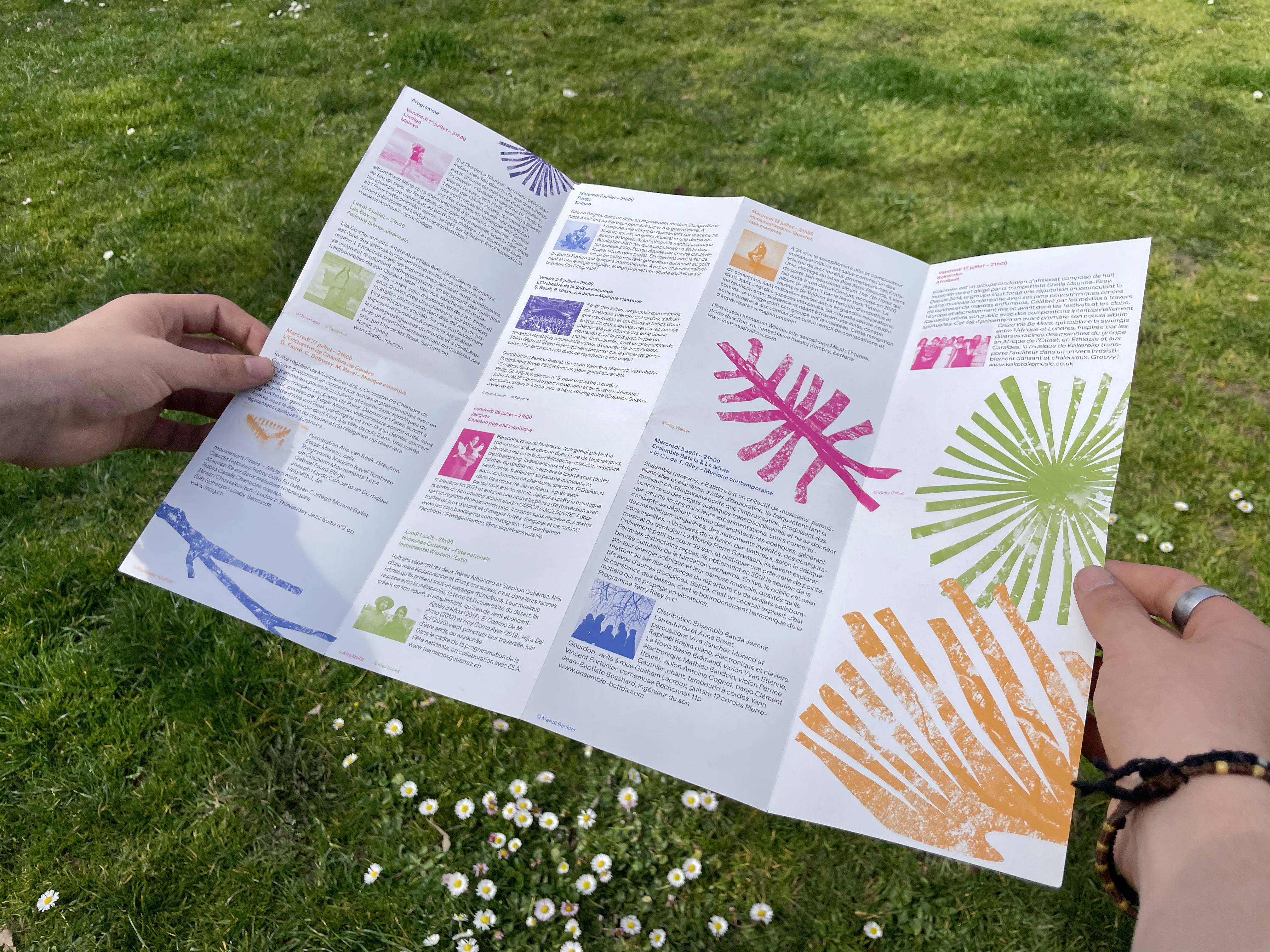 Creation of a flyer for the festival Musiques en été in Geneva (fictitious project). Work around the park where the festival takes place but also about the programming and the practicality of the flyer.