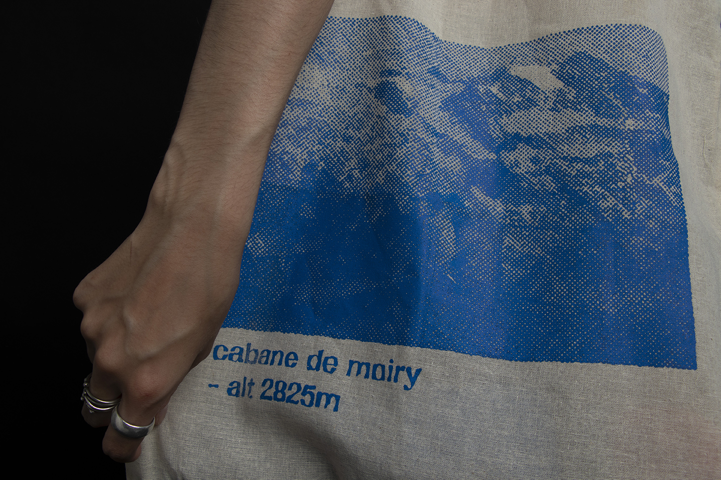 Creation of a visual from a mountain photograph. Prints realized in silk-screening on t-shirts and tot-bags.