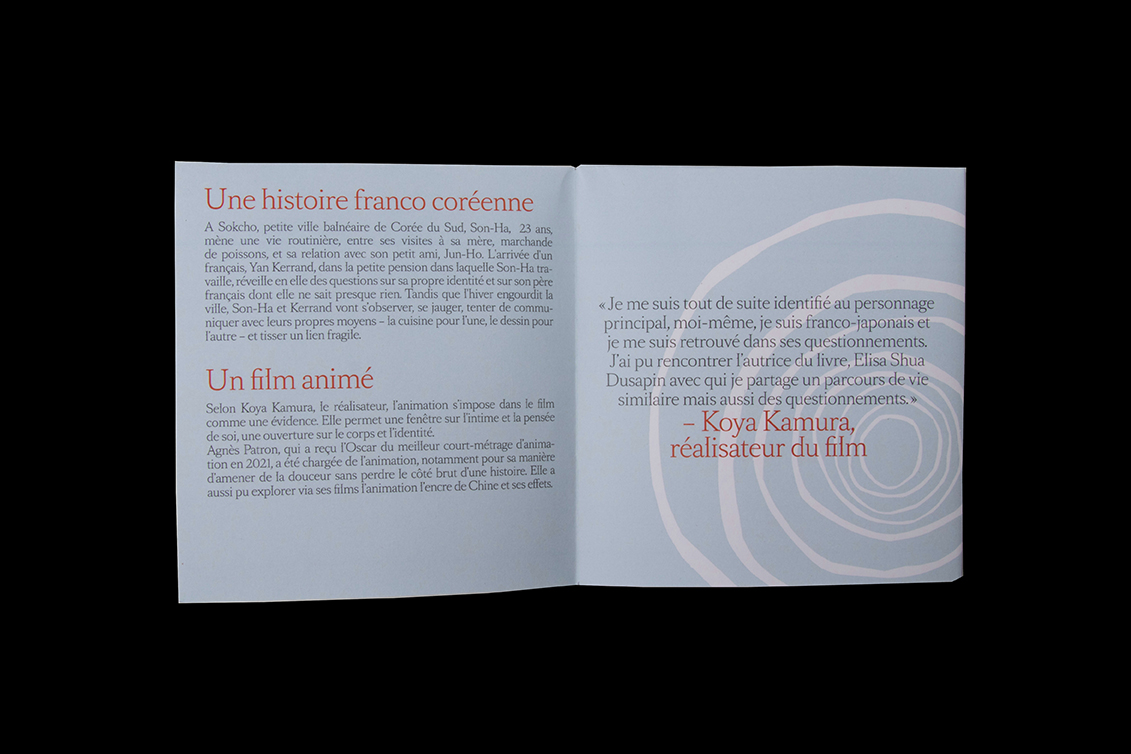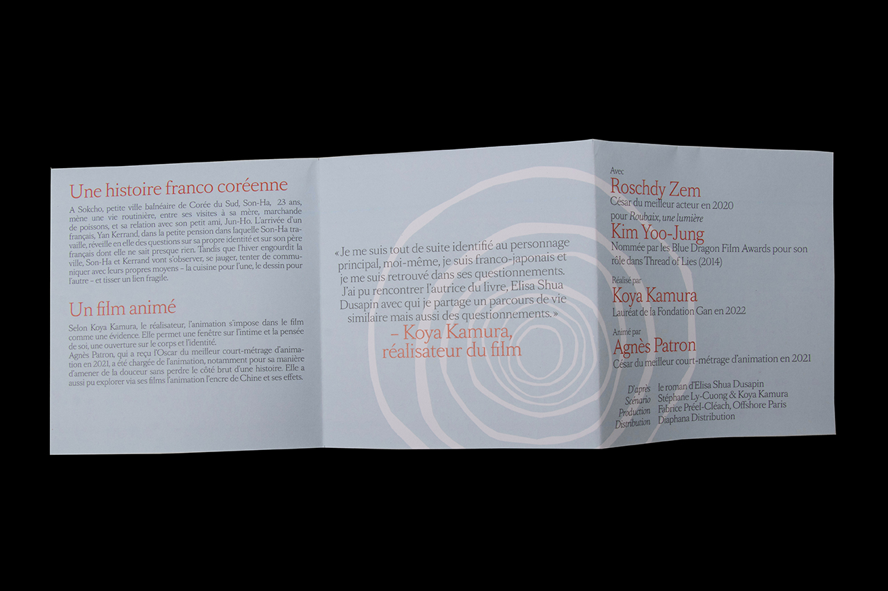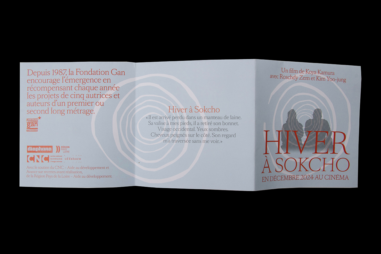 Creation of a poster for the release of the film Winter in Sokcho (fictitious project). Reflection and a week-long workshop on the identity and dual nationality of the fictional characters. Creation of an explanatory flyer about the film, the actors and the director.