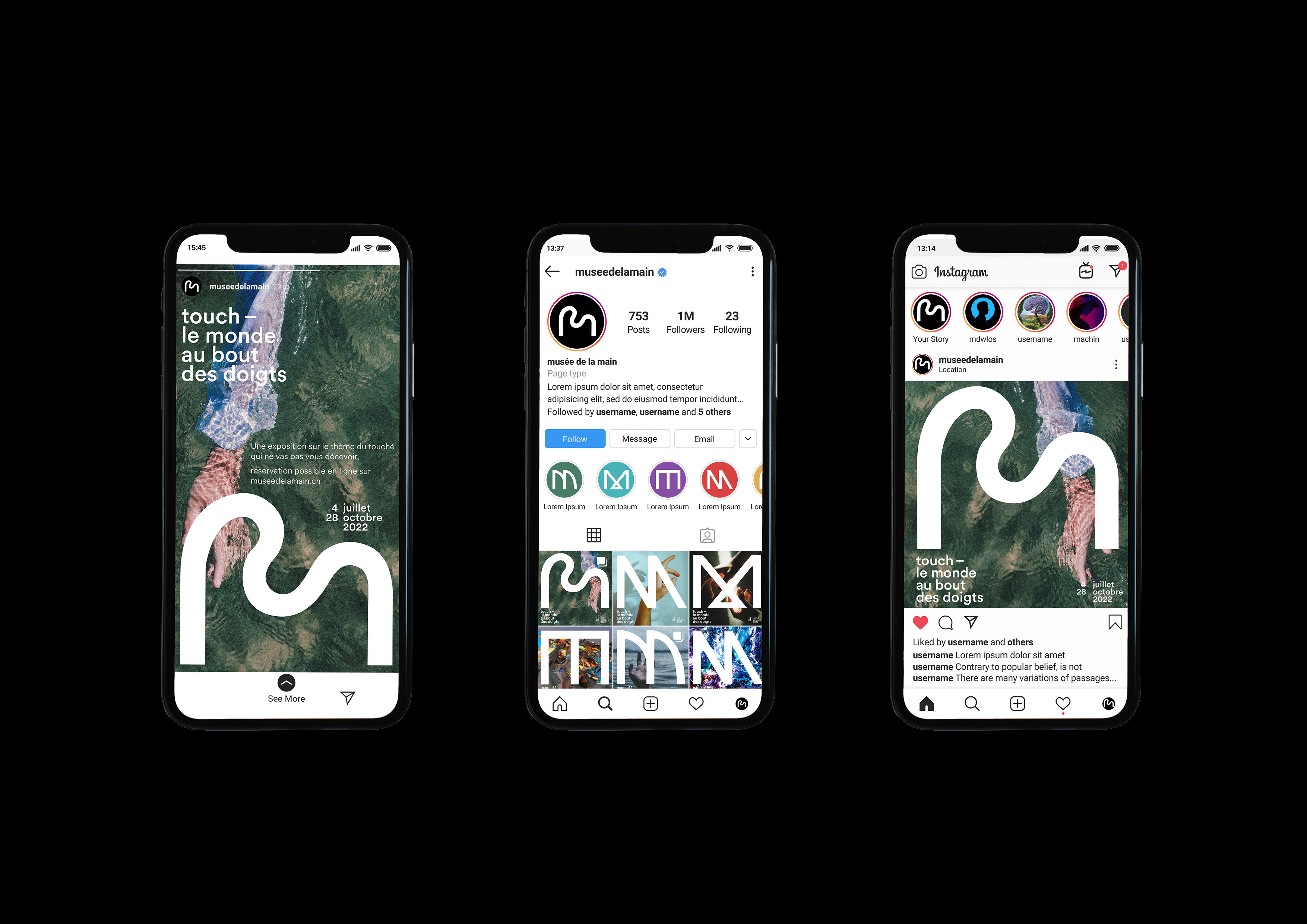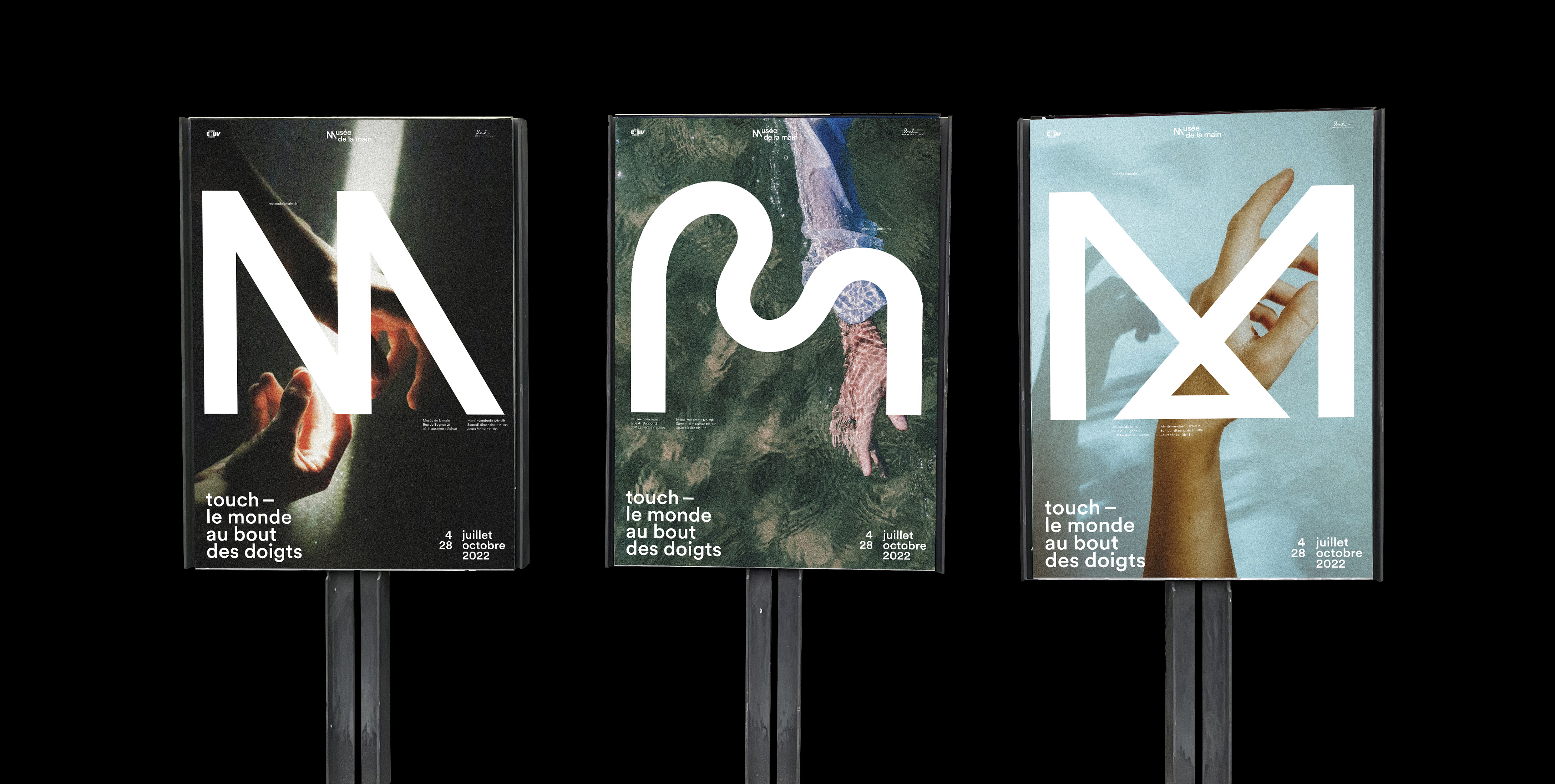 Creation of a visual identity for the museum of the hand in Lausanne (fictitious project). Design of a triptych of posters, social networks and a website model.